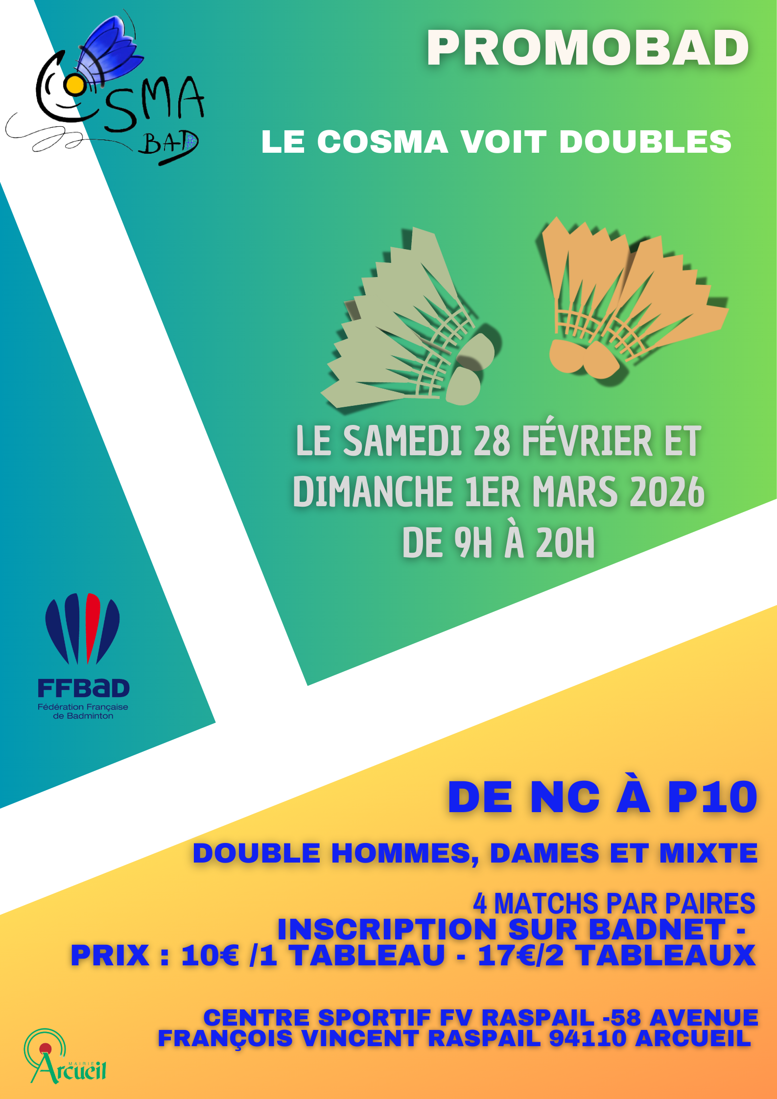 Nous organisons notre Promobad “Le Cosma voit DoubleS”, le 28 février et 1er mars au Centre Sportif François Vincent Raspail à Arcueil !